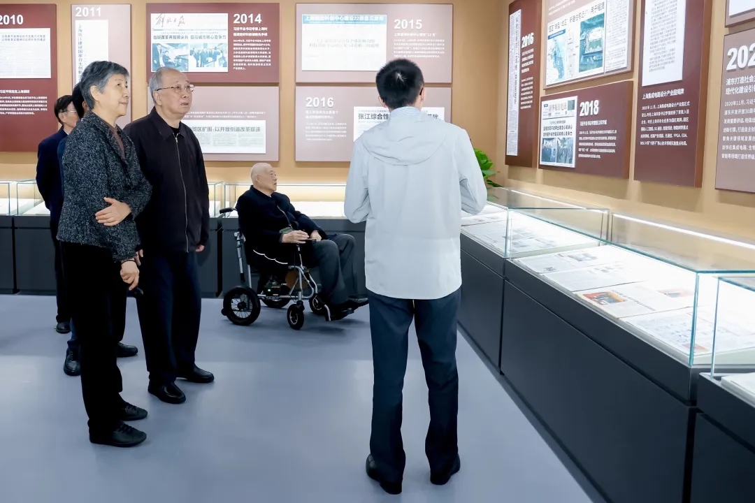在浦东开发开放36周年之际,浦东开发开放亲历者与张江科创企业代表共同参观张江高科陈列馆。